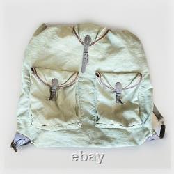 Vintage Army Military Canvas Leather Rucksack Backpack. Leather straps are adjustable and one side has an easy unhook feature. Olive green & teal thread color. The pull string has been replaced, not original. See photos for measurements and condition.